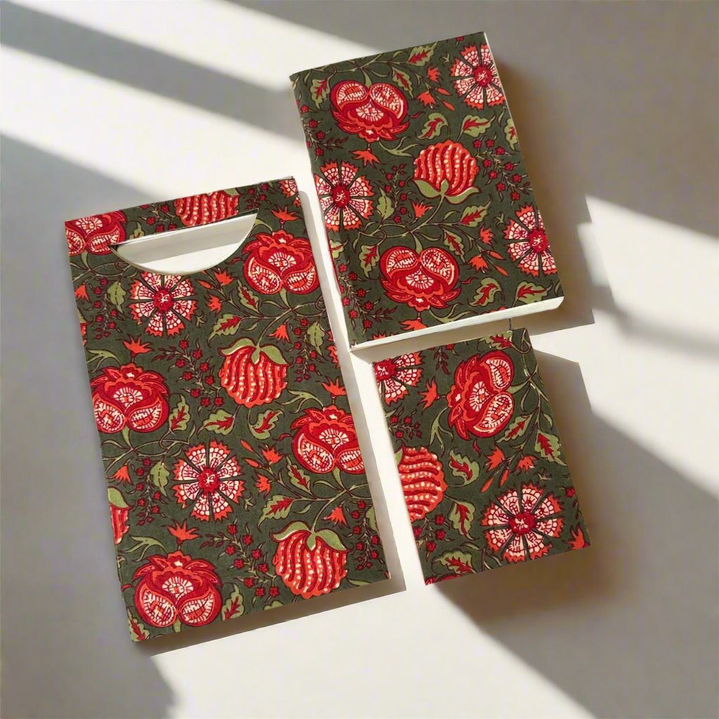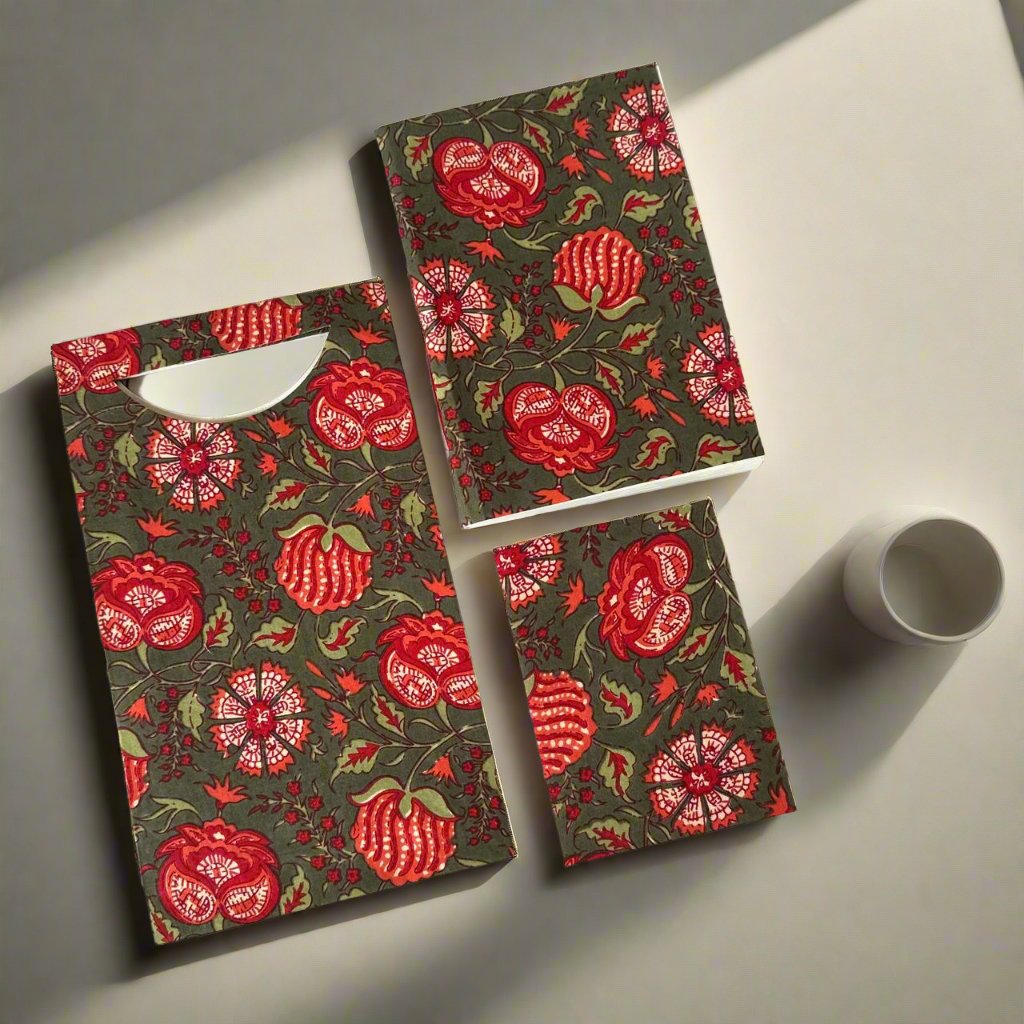 - This is combo set gift bag which consists of soft bound diary, soft bound notepad and a matching gift bag made of handblock printed cloth.