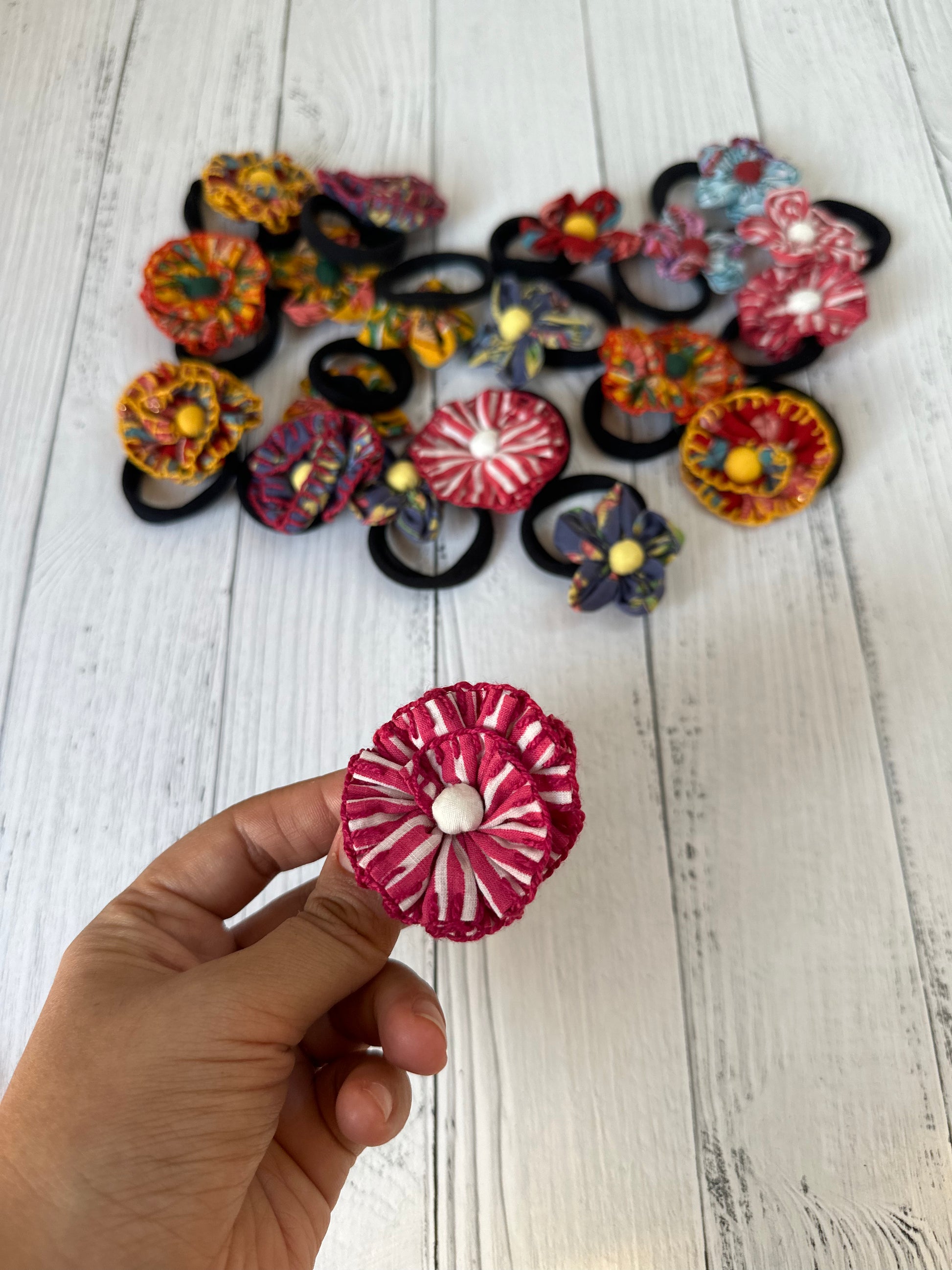 At Kolvi we strive to make sure that our scraps don't go waste. So we created some Zerowaste products which are eco-friendly. These are cute flower rubber bands made of cotton which have a running hand stitch all over.